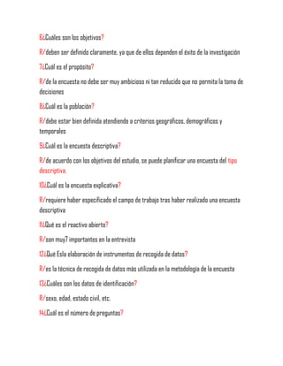Este documento presenta una serie de 30 preguntas y respuestas sobre los métodos de encuesta. Explica conceptos clave como las fases teórico-conceptual y metodológica de una encuesta, los tipos de encuesta descriptiva y explicativa, y los diferentes métodos de aplicación de encuestas como la aplicación directa, por correo y mediante entrevistas. También describe aspectos importantes en la elaboración de cuestionarios e instrumentos de recogida de datos como la redacción y orden de las preguntas, los datos de identificación y el número de pre