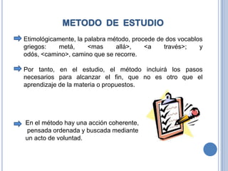 Este documento describe los métodos y técnicas fundamentales para el estudio efectivo. Explica que el método de estudio implica seguir pasos ordenados para lograr el aprendizaje de manera coherente. Entre las técnicas clave se encuentran la prelectura para obtener una visión general del tema, la lectura comprensiva, subrayar ideas principales, elaborar esquemas conceptuales y mentefactos, tomar notas al margen, resumir textos y memorizar la información a través de la comprensión, fijación, conservación, evoc