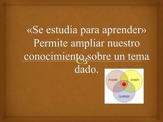 Este documento describe un método de estudio efectivo que incluye pasos como pre-lectura, lectura comprensiva, subrayado, esquemas, resúmenes y memorización. También destaca la importancia de estudiar en grupo, mantener buenas condiciones físicas y elegir un lugar de estudio adecuado. Explica técnicas como el subrayado, mentefactos y mapas conceptuales para mejorar la comprensión y retención de la información.