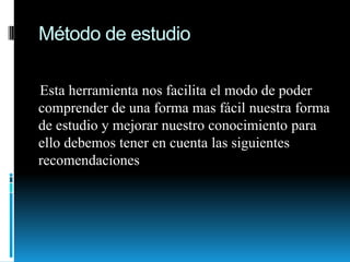 Este documento describe el método de estudio, incluyendo recomendaciones como organizar material, distribuir tiempo de manera flexible, hacer pre lectura, subrayado, esquemas, memorización y resúmenes. También discute condiciones externas e internas como lugar de estudio, alimentación, salud, descanso y estado físico del estudiante. Finalmente, detalla técnicas como pre lectura, lectura analítica, síntesis, socialización, subrayado, mentefactos, mapas conceptuales y resúmenes.