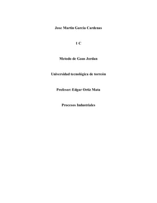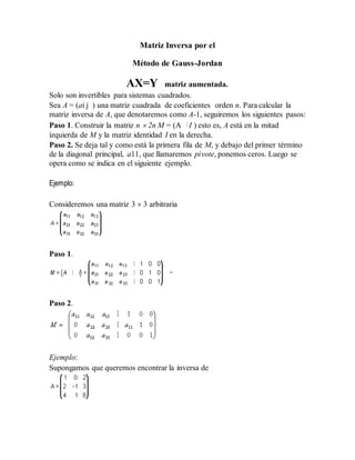 Este documento describe el método de Gauss-Jordan para calcular la inversa de una matriz cuadrada. Explica que primero se construye una matriz aumentada combinando la matriz original y la identidad. Luego, se aplican operaciones de fila para triangularizar la mitad izquierda y obtener ceros debajo del pivote, dejando la inversa en la mitad derecha. Finalmente, se multiplica la matriz original por la obtenida para verificar que el resultado es la identidad.