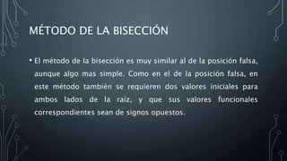 Este documento describe el método de la bisección para encontrar raíces de una ecuación. El método involucra iterativamente dividir el intervalo inicial en dos partes iguales basado en si el valor de la función es positivo o negativo en el punto medio, hasta que el intervalo sea menor a un error especificado. El documento provee detalles sobre cómo calcular el número de iteraciones necesarias y presenta un ejemplo numérico para ilustrar el método.