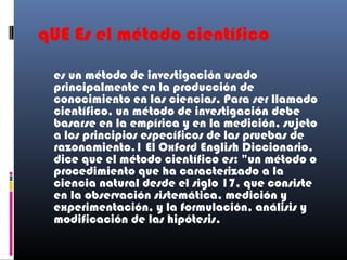 El método científico es un proceso utilizado por los científicos para explicar fenómenos naturales mediante la observación, la formulación de hipótesis y la experimentación. Los científicos observan un fenómeno de manera sistemática, formulan una explicación tentativa y luego realizan experimentos controlados para probar la hipótesis, lo que permite establecer leyes sobre la naturaleza.