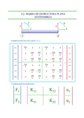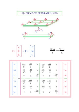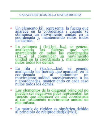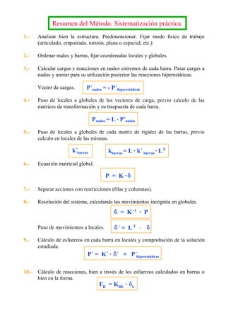 Este documento describe el método de rigidez para el cálculo matricial de estructuras. Explica conceptos básicos como el comportamiento lineal de los materiales y movimientos pequeños. También cubre relaciones fundamentales como equilibrio y compatibilidad de movimientos. Luego, introduce la matriz de rigidez y flexibilidad, y cómo se usan para relacionar fuerzas y desplazamientos. Finalmente, detalla la discretización de la estructura y el cálculo de las rigideces de diferentes tipos de barras elementales.