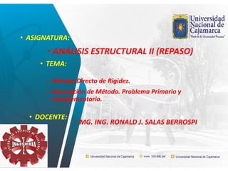 El documento describe el método directo de rigidez, detallando componentes fundamentales como ecuaciones de equilibrio, compatibilidad de movimientos y leyes de comportamiento estructural. Se presentan coeficientes de rigidez, sistemas de coordenadas, ensamblaje de matrices, y aplicaciones prácticas de cálculo de reacciones y esfuerzos en elementos estructurales. También se discuten pasos para calcular momentos y cortantes en estructuras, junto con ejemplos numéricos.