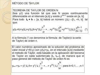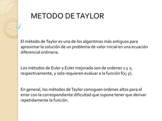 El método de Taylor es un algoritmo antiguo para aproximar soluciones a ecuaciones diferenciales ordinarias. Los métodos de Taylor logran mayores niveles de precisión que los métodos de Euler, pero a costa de mayor complejidad al requerir derivadas repetidas de la función.