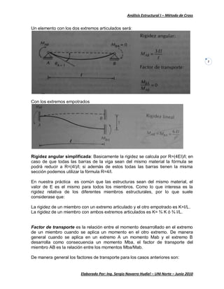 El documento describe el método de Cross para el análisis estructural de vigas continuas. Este método involucra (1) calcular las rigideces de cada tramo, (2) distribuir los momentos de desequilibrio en los nudos usando factores de distribución basados en las rigideces, (3) transportar los momentos distribuidos a los extremos opuestos, y (4) repetir los pasos hasta alcanzar equilibrio. El documento provee detalles sobre cómo calcular rigideces, factores de distribución y transporte, y provee un ej