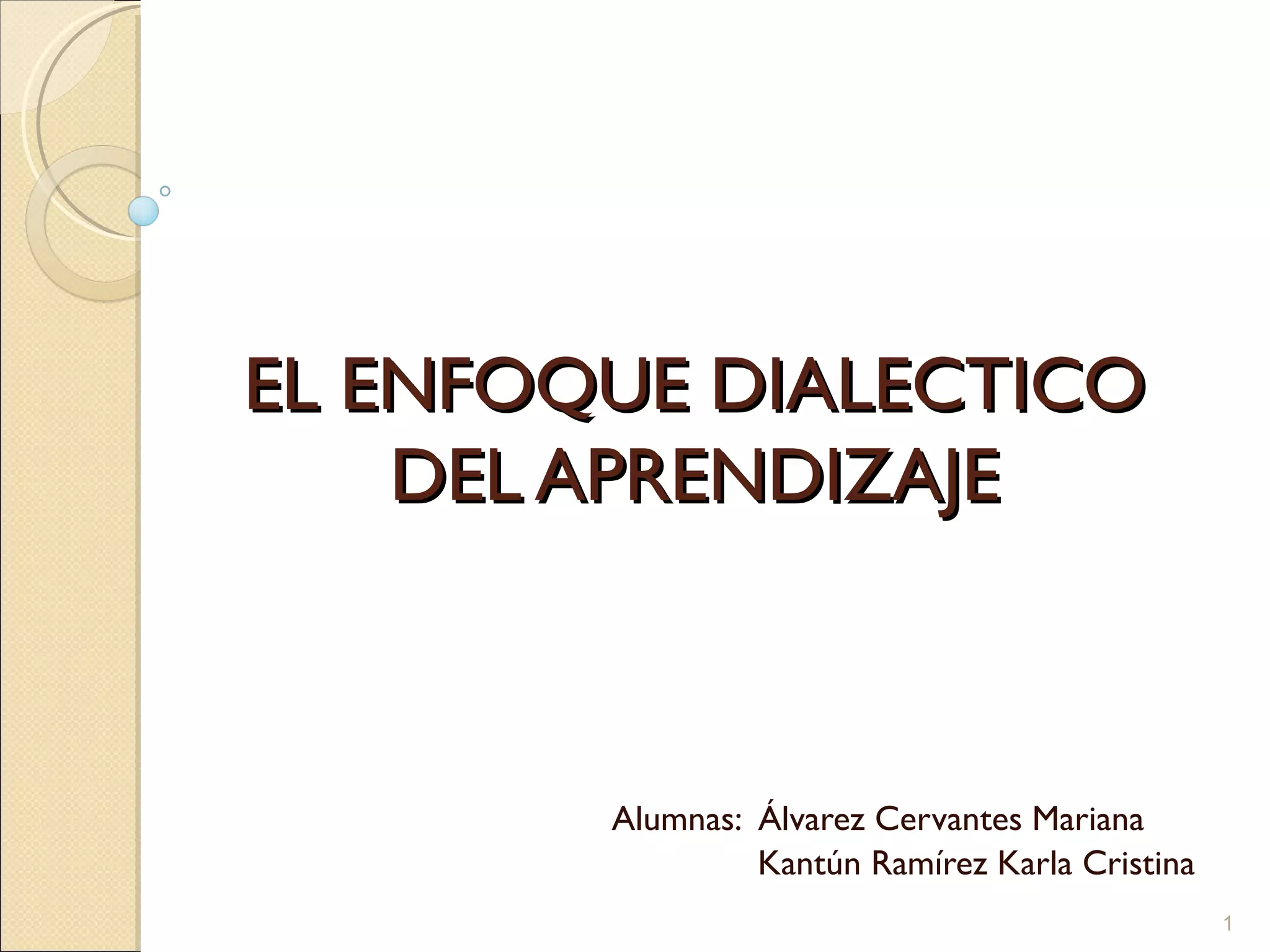 El documento describe el enfoque dialéctico del aprendizaje. Explica que la dialéctica se refiere originalmente al diálogo y la discusión para llegar a la verdad. Luego describe las visiones de Hegel y Marx de la dialéctica, enfocándose en el cambio y la contradicción. Finalmente, explica cómo la dialéctica puede aplicarse al proceso de enseñanza y aprendizaje al verlos como procesos contradictorios pero interdependientes.