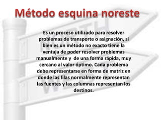 El documento describe el método de la esquina, un método manual para encontrar una solución inicial factible para problemas de programación lineal como el transporte o la asignación. Aunque no es el método más probable para encontrar la solución óptima debido a que ignora los costos relativos, es el método más fácil para determinar una solución básica inicial. El método implica seleccionar la celda de la esquina noroeste y asignar la mayor cantidad posible, actualizar los suministros y requerimientos restantes, y repetir el proceso