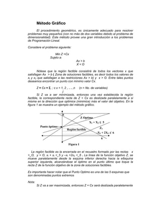1) El método gráfico es útil para resolver problemas de programación lineal con dos variables o menos debido al problema de dimensionalidad. 2) El método involucra graficar la región factible definida por las restricciones y mover paralelamente la línea de la función objetivo para encontrar la solución óptima. 3) Existen cuatro tipos posibles de solución: única, múltiple, factible vacía y no factible.