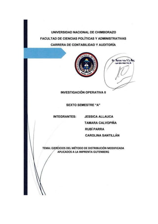 La Imprenta Gutenberg se ubica en Riobamba y se ha dedicado a imprimir desde 1976. Su misión es servir a clientes con soluciones gráficas innovadoras y de calidad, mientras que su visión es ser la empresa líder en impresión en Ecuador. El documento presenta cuatro ejercicios que aplican el método MODI para resolver problemas de distribución, asignando ofertas a demandas de diferentes ciudades de manera óptima.