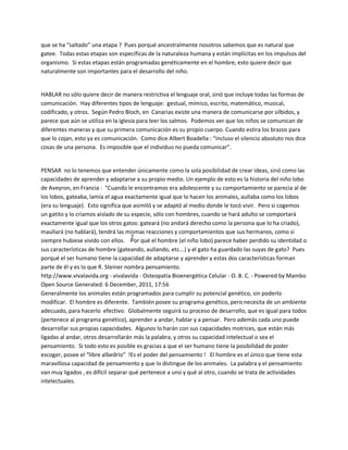 Este documento discute las relaciones entre andar, hablar y pensar según varios autores como Rudolf Steiner, Piaget y Quirós. Explica que estas tres actividades definen al ser humano y se desarrollan de forma secuencial e interdependiente. Según Steiner, el andar se desarrolla alrededor del primer año, el habla hacia los dos años y el pensamiento hacia los tres años a medida que el niño empieza a referirse a sí mismo como "yo". Los autores coinciden en que estas capacidades están interconectadas y que el desar