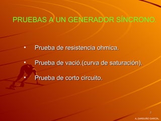 Este documento presenta resúmenes de tres pruebas realizadas a un generador síncrono: 1) Prueba de resistencia ohmica, 2) Prueba de vacío para determinar la curva de saturación, y 3) Prueba de cortocircuito. También describe conceptos como la reactancia síncrona y el triángulo de Potier para analizar el comportamiento del generador bajo diferentes condiciones.