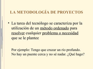 Este documento describe la metodología de proyectos, que consiste en un proceso ordenado para resolver problemas o necesidades. El proceso tecnológico incluye las fases de comprender el problema, desarrollar una solución, planificar la construcción e implementación, y realizar pruebas y ajustes. El proceso se compara a una escalera donde cada paso conduce al siguiente, avanzando desde la comprensión inicial hasta la implementación y mejora de la solución.