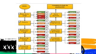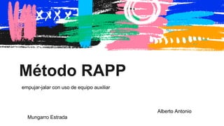 El método RAPP evalúa los riesgos asociados con el empuje y el jalón manual de cargas a través de 7 pasos. Estos incluyen observar la tarea, consultar a los empleados, evaluar factores como la postura, el peso de la carga y las condiciones del equipo, y asignar un código de color para indicar el nivel de riesgo. El objetivo es jerarquizar las tareas que requieren atención más urgente para reducir los riesgos de lesiones musculoesqueléticas.