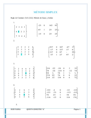 El documento presenta los conceptos y métodos del método simplex para resolver problemas de programación lineal, incluyendo la regla de Crammer, el método de Gauss-Jordan, y la técnica de la M. Se proveen ejemplos resueltos de problemas de maximización con múltiples restricciones.