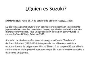 Este documento describe el método educativo musical desarrollado por Shinichi Suzuki. Suzuki observó que los niños aprenden fácilmente su lengua materna a través de la repetición y la escucha. Basado en esto, creó un método para enseñar instrumentos musicales a niños pequeños usando los mismos principios. Su método enfatiza la escucha constante de grabaciones, la participación de los padres, y la presentación de recitales para motivar a los estudiantes. El método de Suzuki ha tenido mucho éxito enseñando