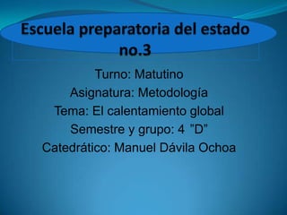 Este documento presenta un proyecto de investigación sobre cómo el calentamiento global afecta a las personas en la colonia 5 de febrero. El cronograma detalla las actividades de la investigación a lo largo de una semana, que incluyen visitar el lugar, tomar fotografías, realizar encuestas y llegar a una conclusión. El marco teórico discute los efectos del calentamiento global en la salud, plantas, animales y tierra. El documento también presenta la hipótesis de que la contaminación ambiental es la principal causa del calentamiento global
