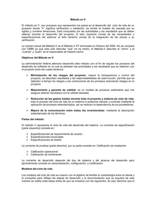 El documento describe el método en V para el desarrollo de proyectos de software. El método en V representa las etapas del ciclo de vida de un proyecto donde la parte izquierda contiene las especificaciones y la derecha contiene las pruebas integradas. El método incluye etapas como requerimientos, diseño, codificación, integración, verificación y mantenimiento. Realiza pruebas a nivel de componentes, interfaz, sistema y aceptación para validar cada etapa antes de pasar a la siguiente.