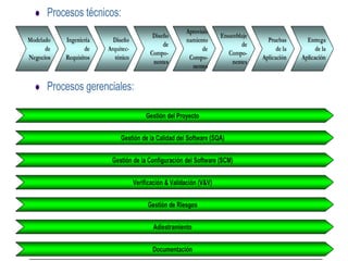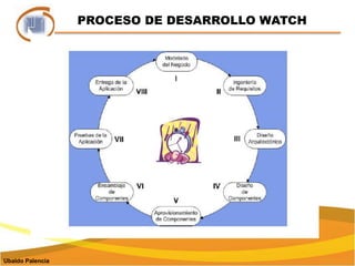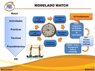 El documento presenta el método WATCH para el desarrollo de componentes de software reutilizables. WATCH incluye modelos de producto, procesos y grupos de desarrollo. El modelo de procesos describe las fases para producir componentes, incluyendo especificación, diseño, implementación, integración, pruebas y mantenimiento. El modelo de producto captura las propiedades de los componentes. El modelo de grupo de desarrollo describe los roles involucrados como analistas, diseñadores e ingenieros de pruebas.