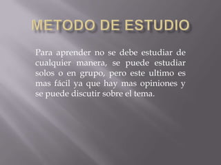 El documento describe el método y técnicas de estudio efectivas. Explica que se debe estudiar de manera estructurada y tener en cuenta la capacidad individual de aprendizaje. Detalla siete pasos clave del método de estudio como prelectura, lectura comprensiva, notas al margen, subrayado, esquema, resumen y memorización. Además, señala condiciones externas como la alimentación, descanso, iluminación y ausencia de ruidos que favorecen el aprendizaje.