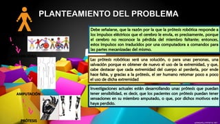 Este documento presenta un estudio sobre el uso de extremidades robóticas en personas con discapacidades físicas. El estudio tiene como objetivo general estudiar las diversas funcionalidades de las extremidades robóticas y como objetivos específicos detallar las necesidades de los pacientes discapacitados, analizar la necesidad de una extremidad robótica y demostrar dicha necesidad. El marco metodológico incluye la revisión de literatura, encuestas y un diseño de investigación de campo con enfoque positivista. La investigación se centra en