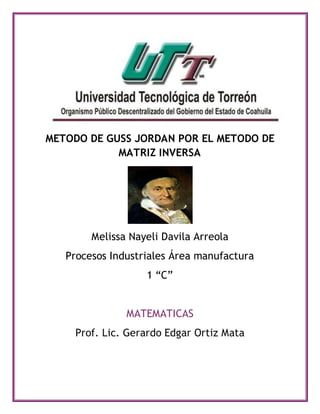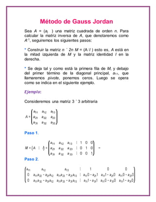 Este documento describe el método de Gauss-Jordan para calcular la matriz inversa de una matriz cuadrada. Primero se construye una matriz combinada con la matriz original a la izquierda y la matriz identidad a la derecha. Luego, se realizan operaciones de fila para convertir la mitad izquierda en una matriz triangular superior. Finalmente, se transforma esta mitad en la matriz identidad, dejando la matriz inversa de la original en la mitad derecha. El documento incluye un ejemplo para ilustrar el proceso.