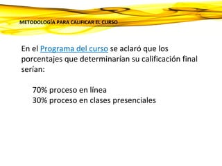 Este documento describe la metodología para calificar un curso de ética en el uso de TIC's. Explica que el 70% de la calificación final proviene del proceso en línea y el 30% restante del proceso presencial. Detalla cómo se califican las diferentes unidades en línea y cómo se promedian para obtener la calificación final en línea. También explica la escala de puntos para calificar las clases presenciales y cómo se promedian las calificaciones en línea y presenciales para obtener la calificación final del curso.