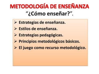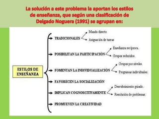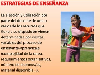 El documento describe diferentes estrategias y estilos de enseñanza en educación física. Explica estrategias como las globales y analíticas, y estilos como el mando directo, asignación de tareas, enseñanza recíproca y descubrimiento guiado. Además, discute el uso de estrategias pedagógicas como las tareas no definidas, semidefinidas y definidas.