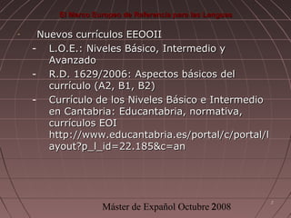 Este documento presenta la metodología para nuevos currículos de idiomas basados en el Marco Común Europeo de Referencia para las Lenguas. Describe 11 principios metodológicos como el uso de tareas comunicativas, la integración de destrezas y contenidos, y textos cercanos a la experiencia del estudiante. También incluye ejemplos de objetivos, actividades y recursos para el nivel B1.