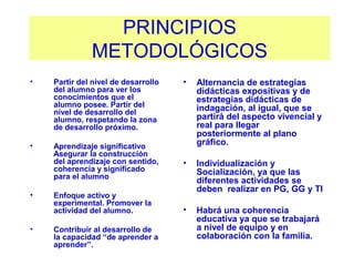 El documento describe los principios metodológicos y las mejores prácticas para enseñar y aprender de manera efectiva en el aula. Se enfatiza la importancia de partir del nivel de desarrollo del alumno, promover un aprendizaje significativo y activo, y alternar entre estrategias didácticas expositivas e indagatorias. También se destaca la necesidad de individualizar y socializar el aprendizaje a través de diferentes actividades grupales.