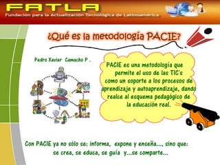 El documento describe la metodología PACIE para el diseño de cursos elearning. PACIE permite crear un entorno motivante que fomenta la construcción de conocimiento a través de la interacción y el trabajo colaborativo. Un curso PACIE consta de 3 bloques: bloque 0 para presentar el curso, bloque académico con contenidos y actividades, y bloque de cierre para retroalimentación.