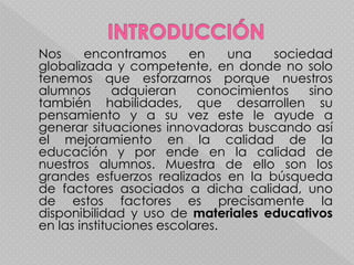 El documento describe la importancia de los recursos educativos en una sociedad globalizada y competitiva. Explica que los recursos educativos no solo ayudan a los estudiantes a adquirir conocimientos, sino también habilidades para desarrollar su pensamiento y generar innovación. Los recursos educativos permiten a los docentes seleccionar contenidos con mayor precisión, orientar el aprendizaje y la evaluación, y transformar el proceso de enseñanza. También ayudan a los estudiantes a estimular procesos cognitivos, afectivos y social