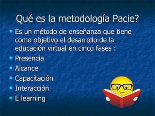 La metodología Pacie es un método de enseñanza virtual en cinco fases que se implementa en un entorno virtual de aprendizaje. El Bloque Académico es una parte central de esta metodología y contiene cuatro secciones (Exposición, Rebote, Construcción y Comprobación) que corresponden a diferentes momentos de la enseñanza, utilizando herramientas adecuadas como presentaciones y actividades del LMS. El objetivo del Bloque Académico es proporcionar los elementos necesarios para la construcción del conocimiento sobre determinados