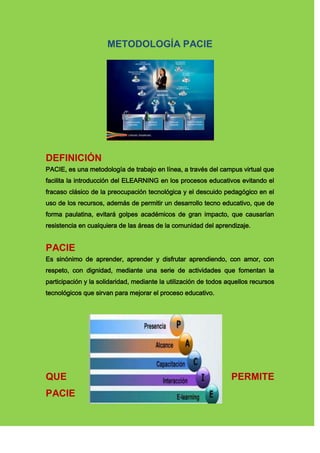 El documento describe la metodología PACIE, que facilita la introducción del aprendizaje en línea en los procesos educativos. PACIE permite un desarrollo tecnológico-educativo gradual que evita impactos académicos negativos. PACIE promueve el aprendizaje participativo, respetuoso y significativo mediante el uso de recursos tecnológicos. Busca incluir las TIC en la educación considerando al docente como figura principal y fomentando el uso organizado de las TIC en el aula para complementar actividades