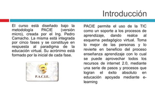 La metodología PACIE se compone de 5 fases (Presencia, Alcance, Capacitación, Interacción y E-learning) para crear un aula virtual en Dokeos. La primera fase (Presencia) busca darle personalidad al aula y hacerla atractiva para los estudiantes. La segunda fase (Alcance) se enfoca en la organización de la información para generar aprendizaje. La tercera fase (Capacitación) prepara a los docentes para la enseñanza virtual. La cuarta fase (Interacción) genera una