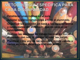 Este documento proporciona recomendaciones para atender a alumnos con necesidades educativas especiales. Sugiere establecer rutinas en el aula, adaptar la metodología a todos los estudiantes, organizar las unidades en base a las características de cada estudiante, realizar sesiones de trabajo individualizadas, y planificar cada sesión abarcando varios aspectos. También recomienda medidas de atención a la diversidad como el enriquecimiento curricular y técnicas de enseñanza flexibles y centradas en el descubrimiento.