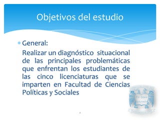 El documento presenta la metodología para realizar una encuesta sobre la percepción de los estudiantes de la Facultad de Ciencias Políticas y Sociales (FCPyS) de la UNAM respecto a diversas problemáticas académicas y formativas. Los objetivos incluyen diagnosticar la situación actual, evaluar la participación política y el conocimiento sobre consejeros estudiantiles y legislación universitaria. Se detalla el proceso de recolección de datos, el tamaño de la muestra y los pasos logísticos necesarios para llevar a cabo la investigación.