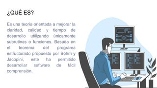 Este documento describe la programación estructurada, incluyendo que se basa en tres estructuras (secuencia, selección e iteración), y proporciona ventajas como programas más fáciles de entender y mantener, y desventajas como menor flexibilidad para cambios. Explica que cada estructura funciona de manera diferente dependiendo de si las sentencias se ejecutan en orden, según el valor de una variable, o mientras una condición sea verdadera.