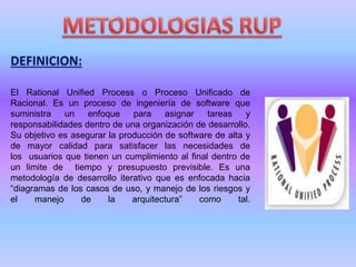Este documento presenta la metodología Rational Unified Process (RUP) y su aplicación para el desarrollo de un sistema de gestión de artículos deportivos. RUP es un proceso iterativo que incluye fases de inicio, elaboración, desarrollo y transición. Se utilizan plantillas para facilitar el modelado del negocio, requisitos, análisis, diseño, implementación y pruebas. El objetivo es mostrar el desarrollo del proyecto siguiendo RUP.