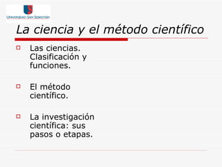 El documento describe los conceptos fundamentales de la ciencia y el método científico. Explica que la ciencia busca explicar los fenómenos observables mediante el método científico. Luego clasifica las ciencias en fácticas, que se basan en hechos y experimentos, e incluyen las ciencias naturales y sociales, y formales, como la lógica y las matemáticas. Finalmente, resume los diferentes métodos científicos como la observación, medición y experimentación.