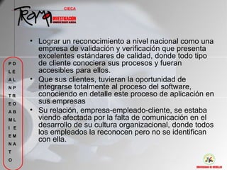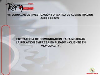 Este documento presenta una estrategia de comunicación propuesta para mejorar la relación entre la empresa V&V Quality, sus empleados y clientes. Actualmente, la falta de comunicación está afectando la cultura organizacional de la empresa. El objetivo general es implementar una estrategia de comunicación para fortalecer esta relación. Los objetivos específicos incluyen revisar teorías de otras empresas, crear procesos que apoyen la identidad y ética de la empresa, e identificar y evaluar los factores que influyen en el proceso de comunicación para una adec