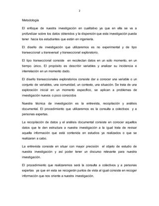 Este documento presenta la metodología de una investigación sobre los factores que influyen en la cotización salarial de los ingenieros industriales. Se utilizará un enfoque cualitativo y un diseño no experimental y transversal mediante entrevistas y análisis documental a ingenieros y empresas. El universo son los ingenieros industriales de San Luis Potosí. Se entrevistarán empresas e ingenieros durante 20 días para conocer sus perspectivas sobre parámetros y habilidades consideradas para fijar salarios.