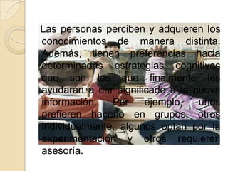 El documento describe diferentes métodos y estilos de aprendizaje. Las personas aprenden de maneras diversas, ya sea de forma individual o en grupo, a través de la experimentación o la asesoría. Los estilos de aprendizaje se refieren a las estrategias cognitivas preferidas por los estudiantes para procesar nueva información. Algunas técnicas de aprendizaje incluyen la experiencia concreta, observación reflexiva, conceptualización abstracta y experimentación activa. Los métodos de aprendizaje pueden ser auditivos, visuales, táctiles o