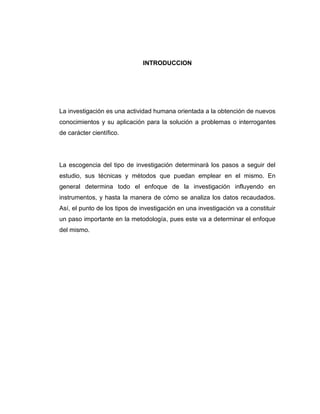 Este documento describe los diferentes tipos de investigación y sus objetivos correspondientes. Explica que el tipo de investigación determina los pasos a seguir, las técnicas y métodos empleados. Luego define e identifica cada tipo de investigación (exploratoria, descriptiva, analítica, comparativa, explicativa, predictiva, proyectiva, interactiva, confirmatoria y evaluativa) de acuerdo a su nivel (perceptual, aprehensivo, comprensivo e integrativo) y objetivo (explorar, describir, analizar, comparar, explicar, predecir,