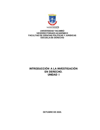 El documento proporciona una introducción a la investigación en derecho, abordando conceptos clave como ciencia y conocimiento, así como los tipos y características de la investigación. Se discuten los paradigmas de investigación, incluyendo el positivismo, post-positivismo, teoría crítica y constructivismo, estableciendo la relación entre ciencia, conocimiento e investigación. Además, se enfatiza la importancia de la ética en el proceso investigativo, resaltando la responsabilidad del investigador hacia los participantes.