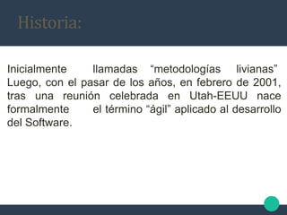 El documento describe varias metodologías ágiles para el desarrollo de software. Se menciona que las metodologías ágiles se desarrollaron originalmente como "metodologías livianas" y que el término "ágil" se adoptó formalmente en 2001. Luego, resume algunas de las metodologías ágiles más populares como SCRUM, Crystal Methodologies, DSDM y FDD, destacando sus características clave como iteraciones cortas, trabajo en equipo y adaptación al cambio.