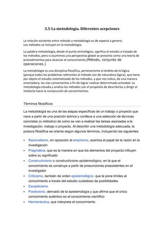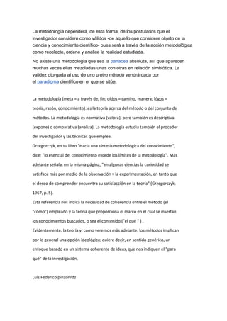 La metodología se refiere al estudio sistemático de los métodos para lograr un objetivo o actividad. Examina y analiza los métodos para describirlos y guiar el entendimiento hacia el conocimiento. Depende de los postulados que el investigador considere válidos sobre el objeto de estudio y conocimiento científico, ya que a través de la acción metodológica se recolecta, ordena y analiza la realidad estudiada. No existe una metodología absoluta, por lo que a menudo se mezclan en relación simbió