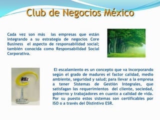 Este documento describe los servicios de consultoría de una organización llamada Club de Negocios de Alto Rendimiento México. Ofrece capacitación, asesoría y certificaciones en responsabilidad social corporativa y sistemas de gestión para ayudar a las empresas a mejorar su desempeño de manera sostenible. Su metodología involucra diagnósticos, capacitación, planeación estratégica, estructuración de comités y certificaciones para apoyar la implementación integral de prácticas sustentables.