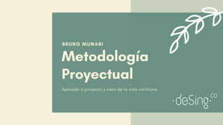 Este documento describe la metodología de proyectos de Bruno Munari. Explica los pasos para definir y resolver un problema, incluyendo la recopilación de datos, análisis, creatividad, experimentación con materiales, desarrollo de modelos, verificación y solución final. Luego aplica esta metodología a dos problemas cotidianos: el consumismo del maquillaje y hacer ejercicio de forma segura en el gimnasio.